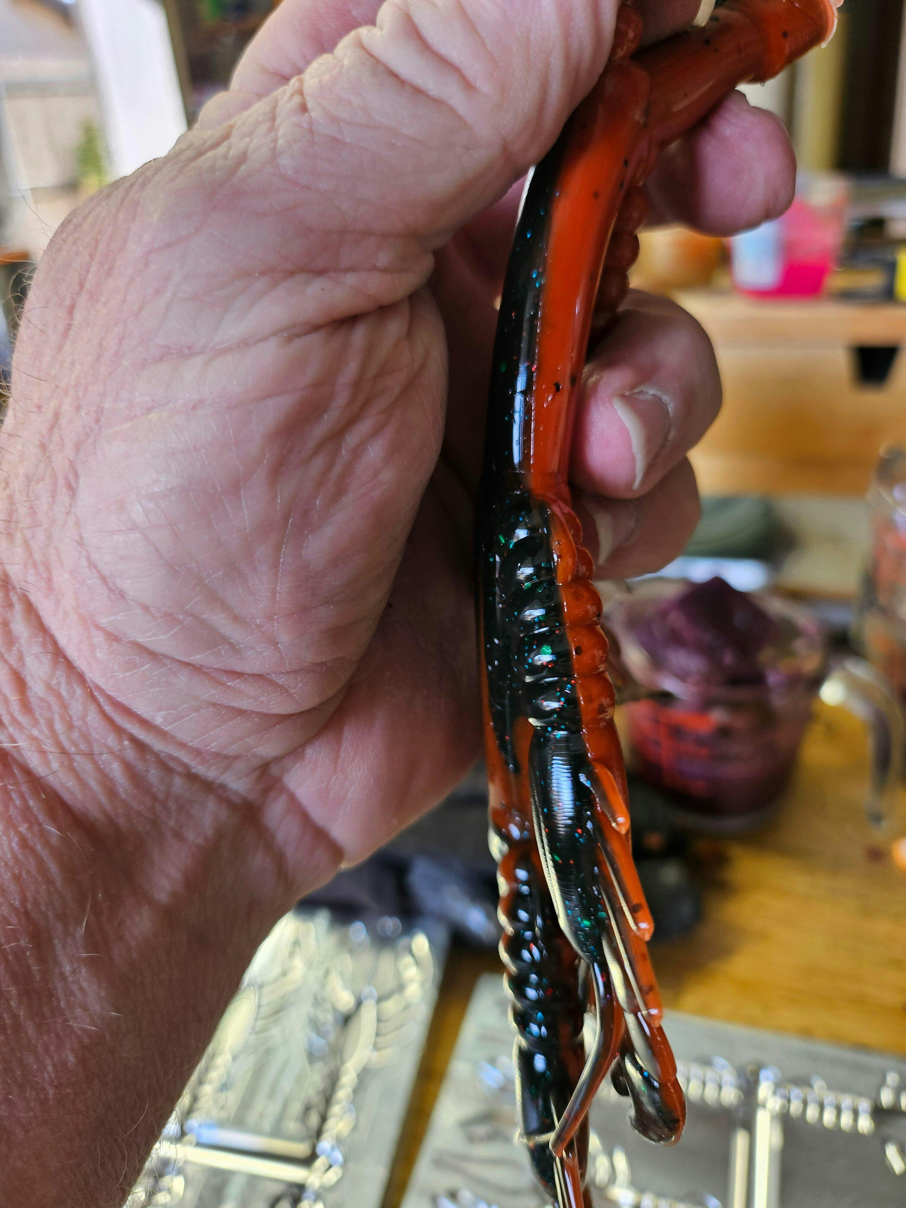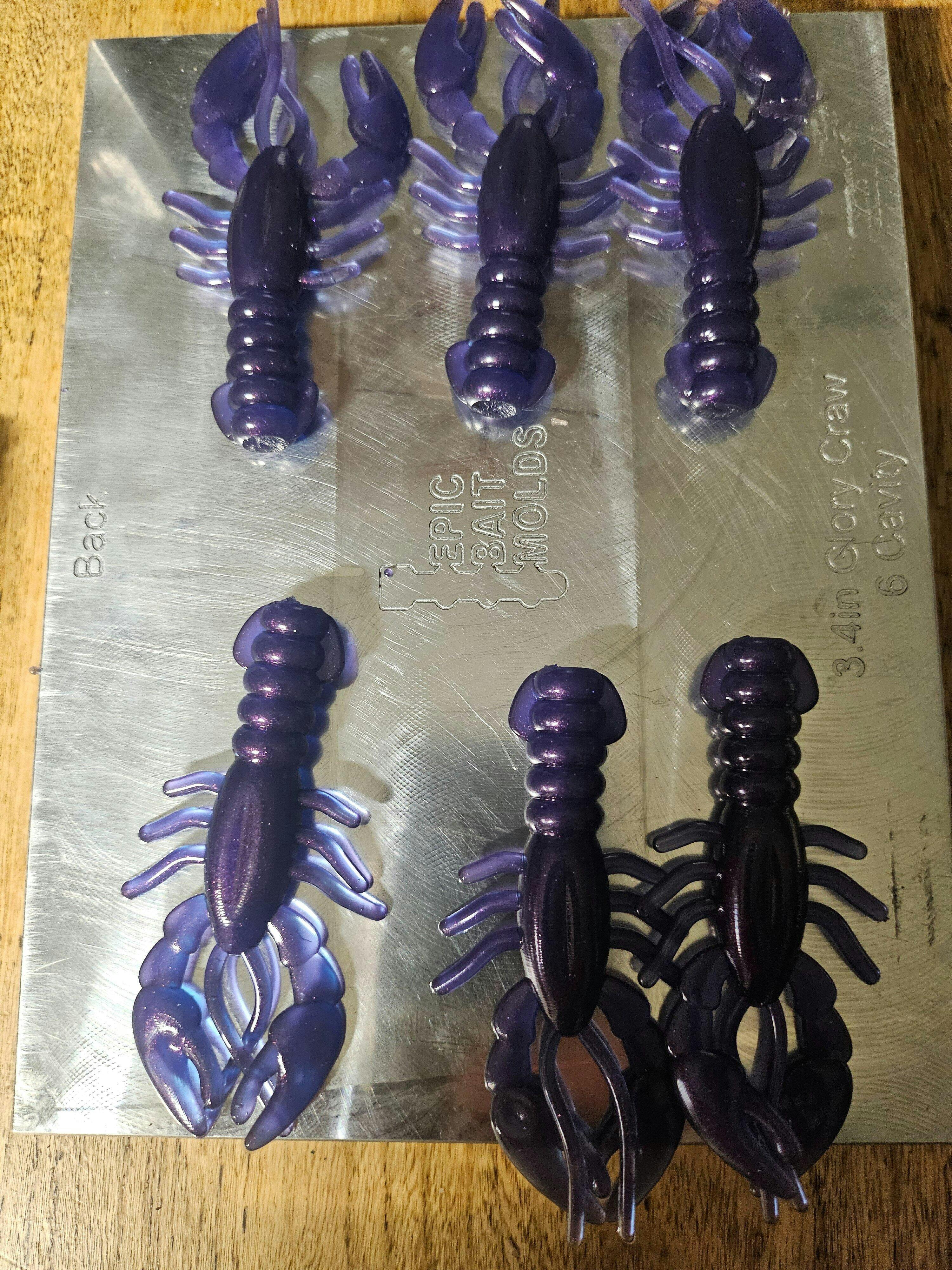 The 3.4 Inch Glory Craw bait has a total length of 3.4 inches from tail to tips of claw/antenna and a body thickness of .5".  This bait features a lifelike craw profile featuring legs, antenna, and claws in the "defense position."  The top of the bait features a small indented hook slot to help align your hook point and to help hide the hook point when rigged with a swimbait or EWG hook. This mold is for use with hand injectors and can be laminated.