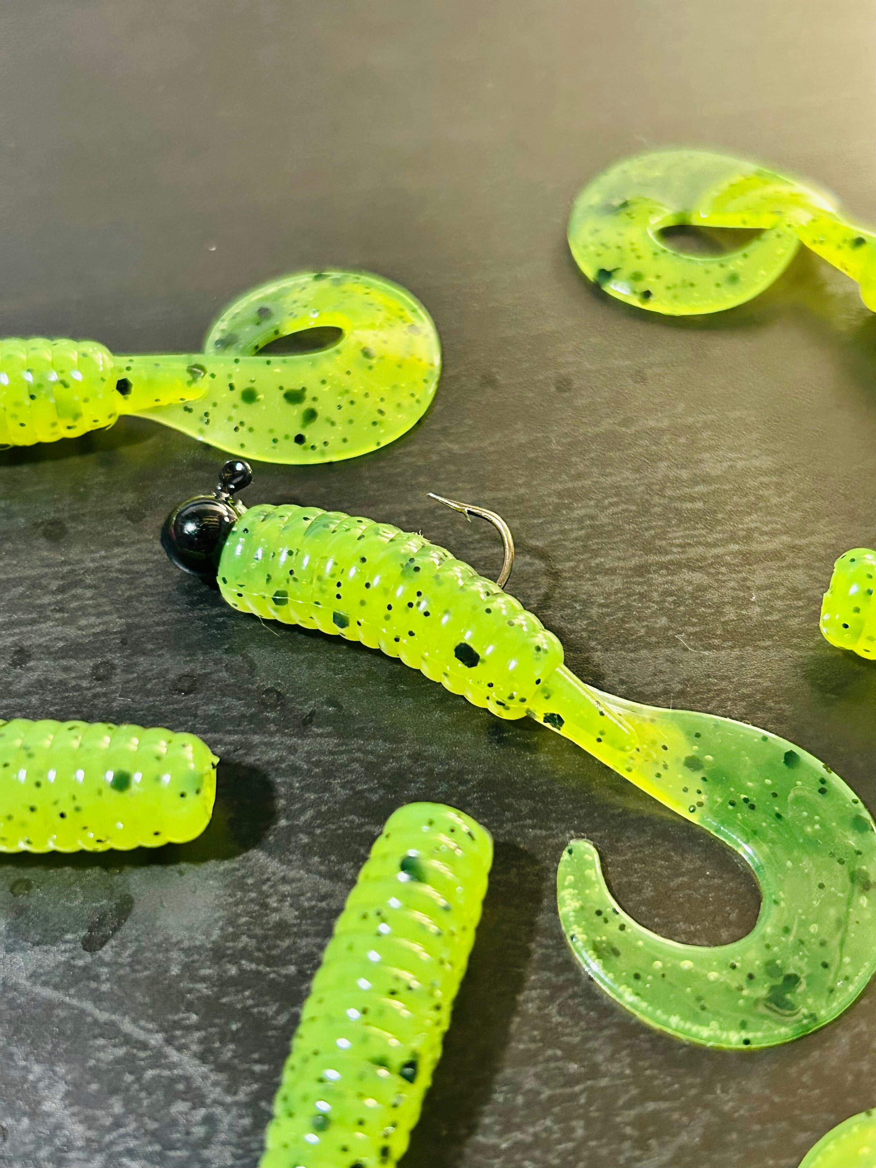 This 3 Inch Curly Tail Grub's body thickness is .36", the body length from nose to base of tail is 1.05" and the curly tail is .05" thick. The overall length of the bait is 3 inches with the tail extended/hanging. These grubs feature unbeatable tail action and shoot perfect.