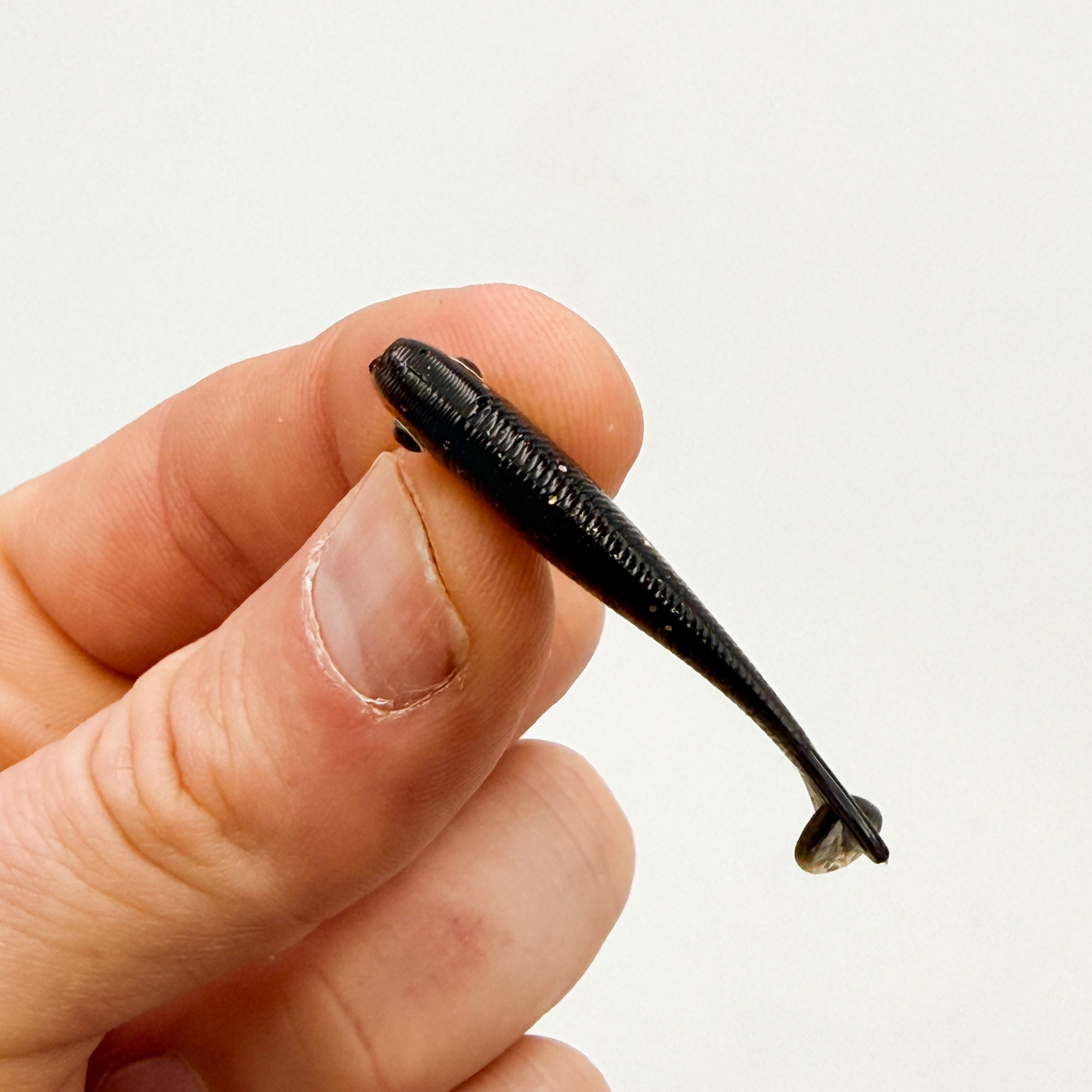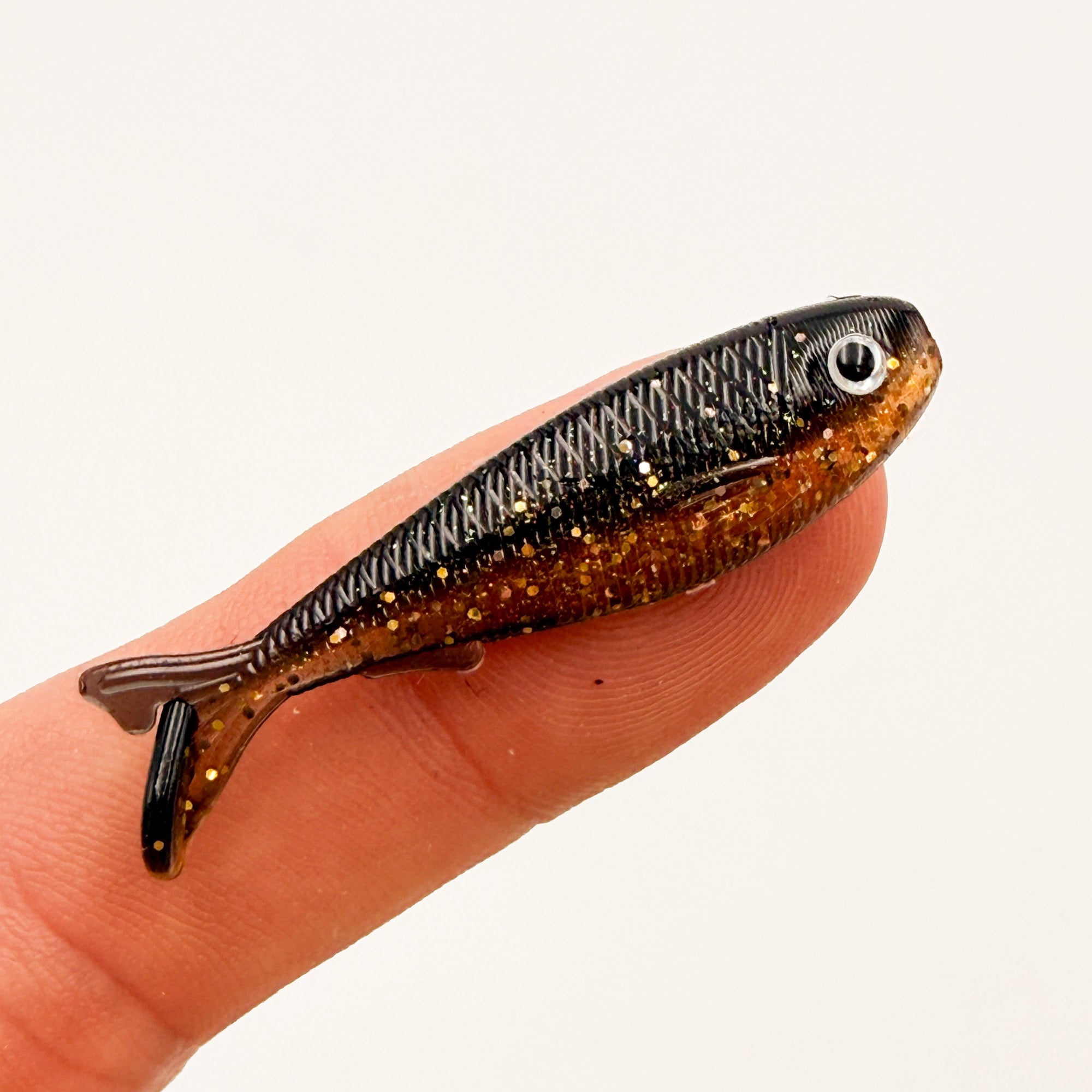 The 1.7" SlayBait measures 1.7" from nose to tip of tail and features a sleek body shape, scales, gill plate, fin details, and a flat spot to glue on eyes that measures roughly .13" in diameter. The tail features a paddle on the lower fin and produces a kicking action at any speed. The body is roughly .41" tall and .245" wide.
