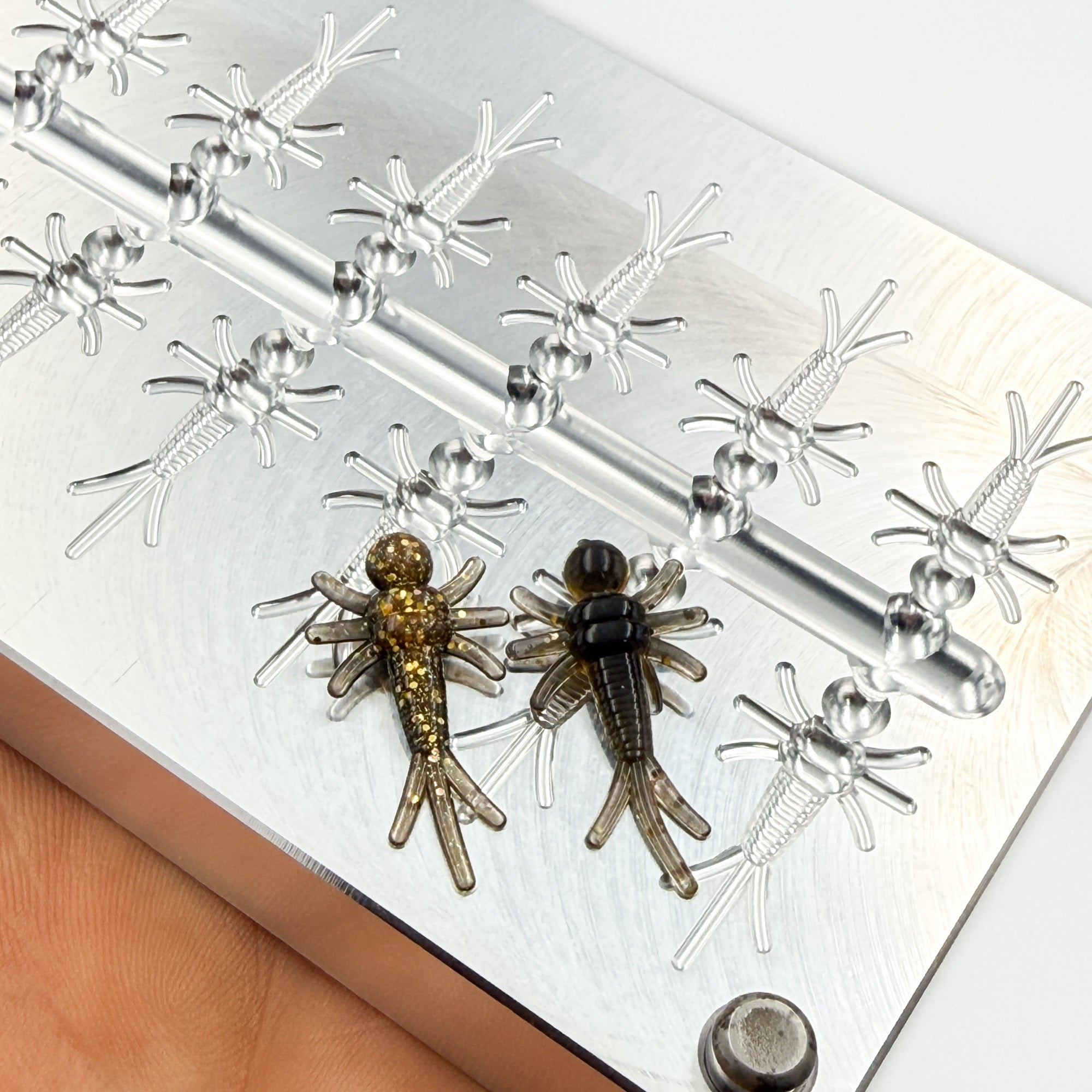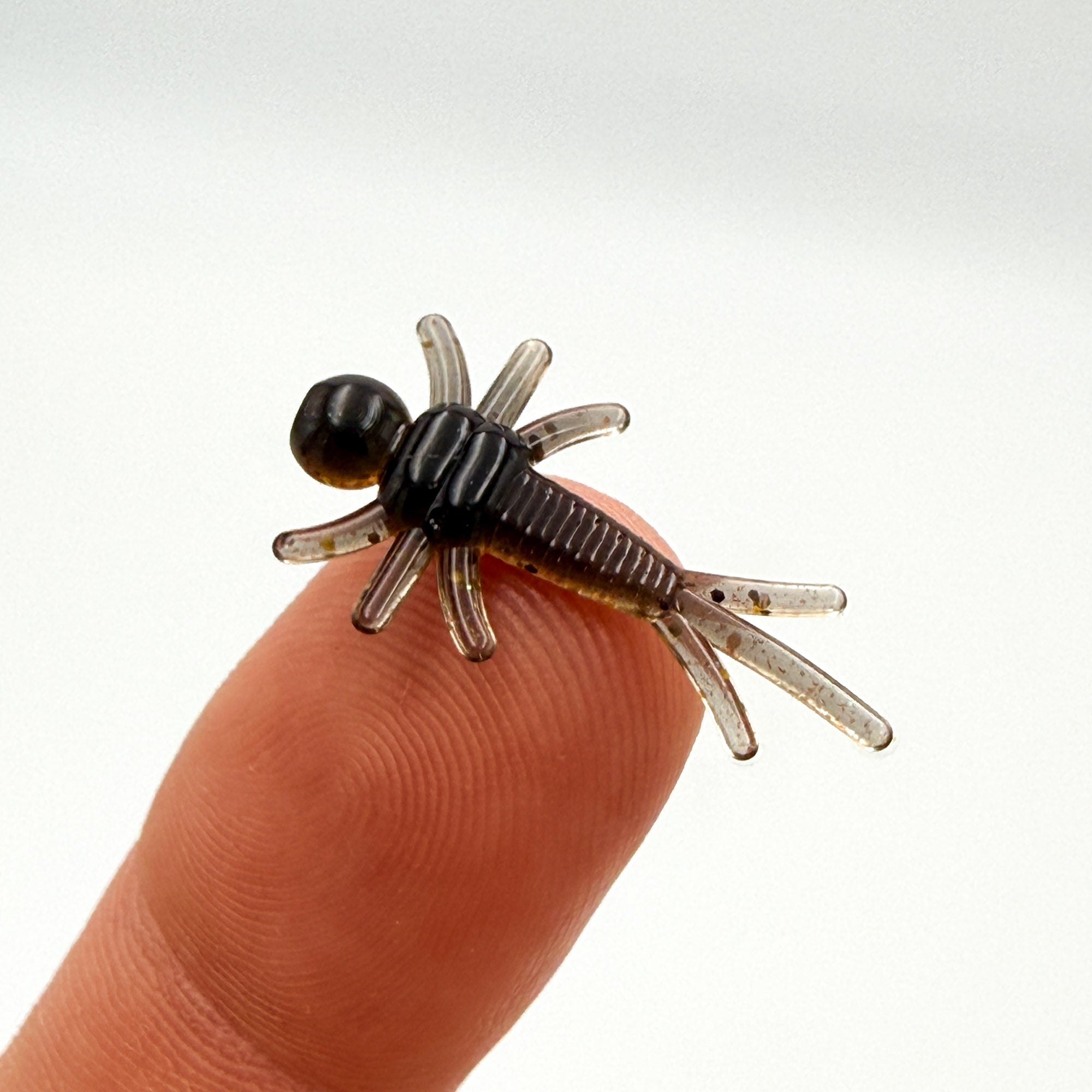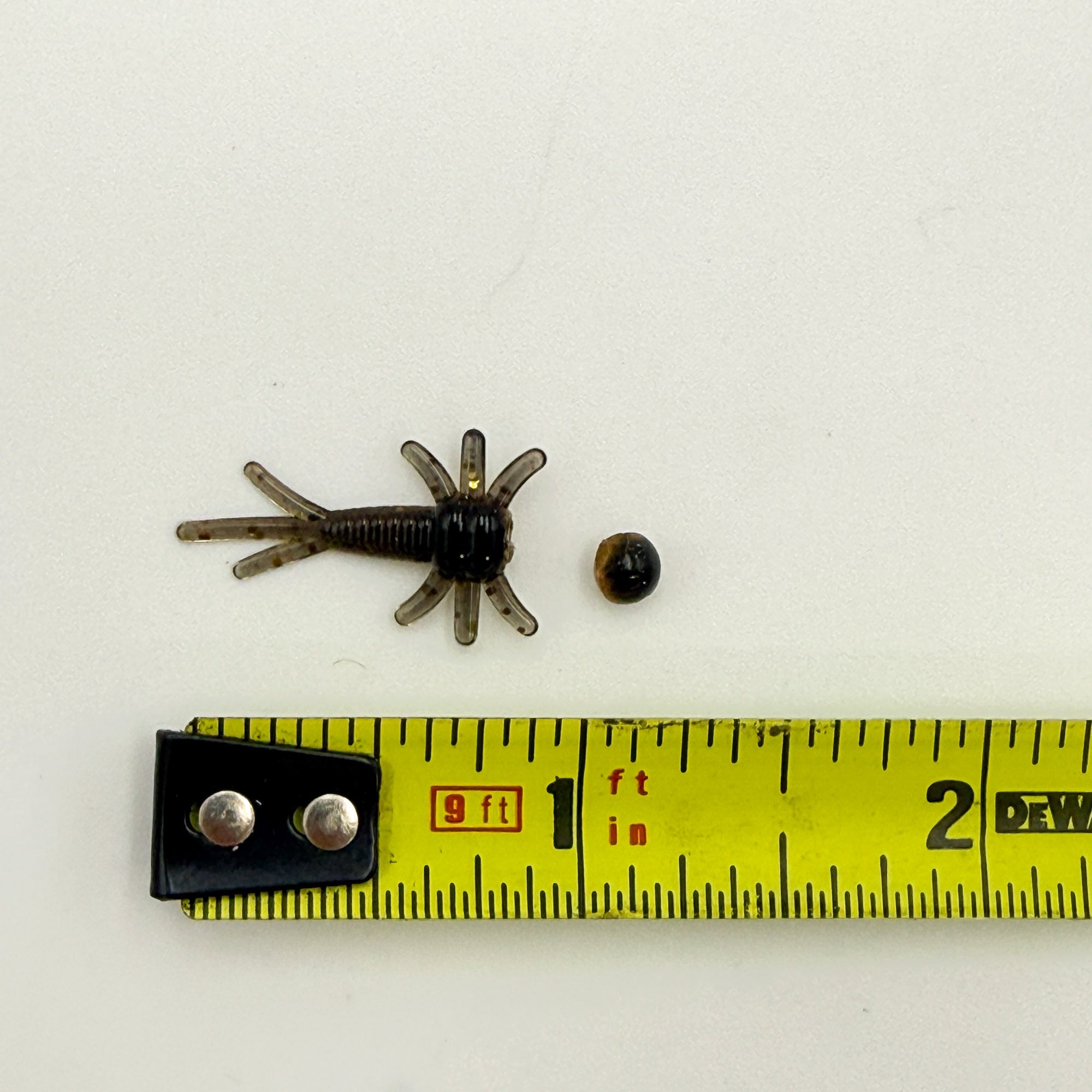 The 1 Inch Ice Nymph measures 1" from tip to tail, .55" across (including legs), the body section is .225" wide and .175" thick. This bait features 6 legs, 3 tails, a textured body a round head which is removable to shorten the overall bait length to .825" including the tails.