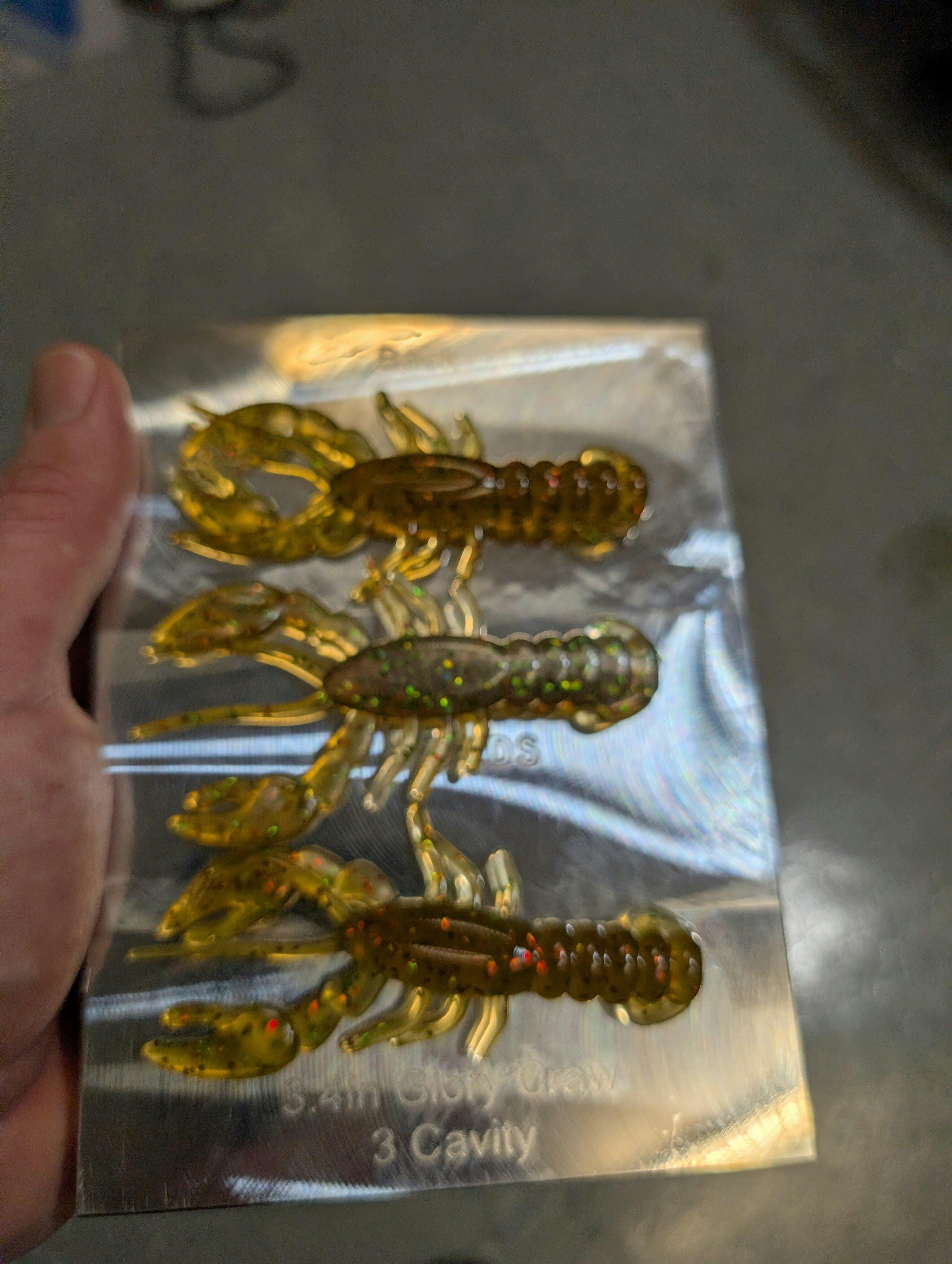 The 3.4 Inch Glory Craw bait has a total length of 3.4 inches from tail to tips of claw/antenna and a body thickness of .5". This bait features a lifelike craw profile featuring legs, antenna, and claws in the "defense position." The top of the bait features a small indented hook slot to help align your hook point and to help hide the hook point when rigged with a swimbait or EWG hook. This mold is for use with hand injectors and can be laminated.