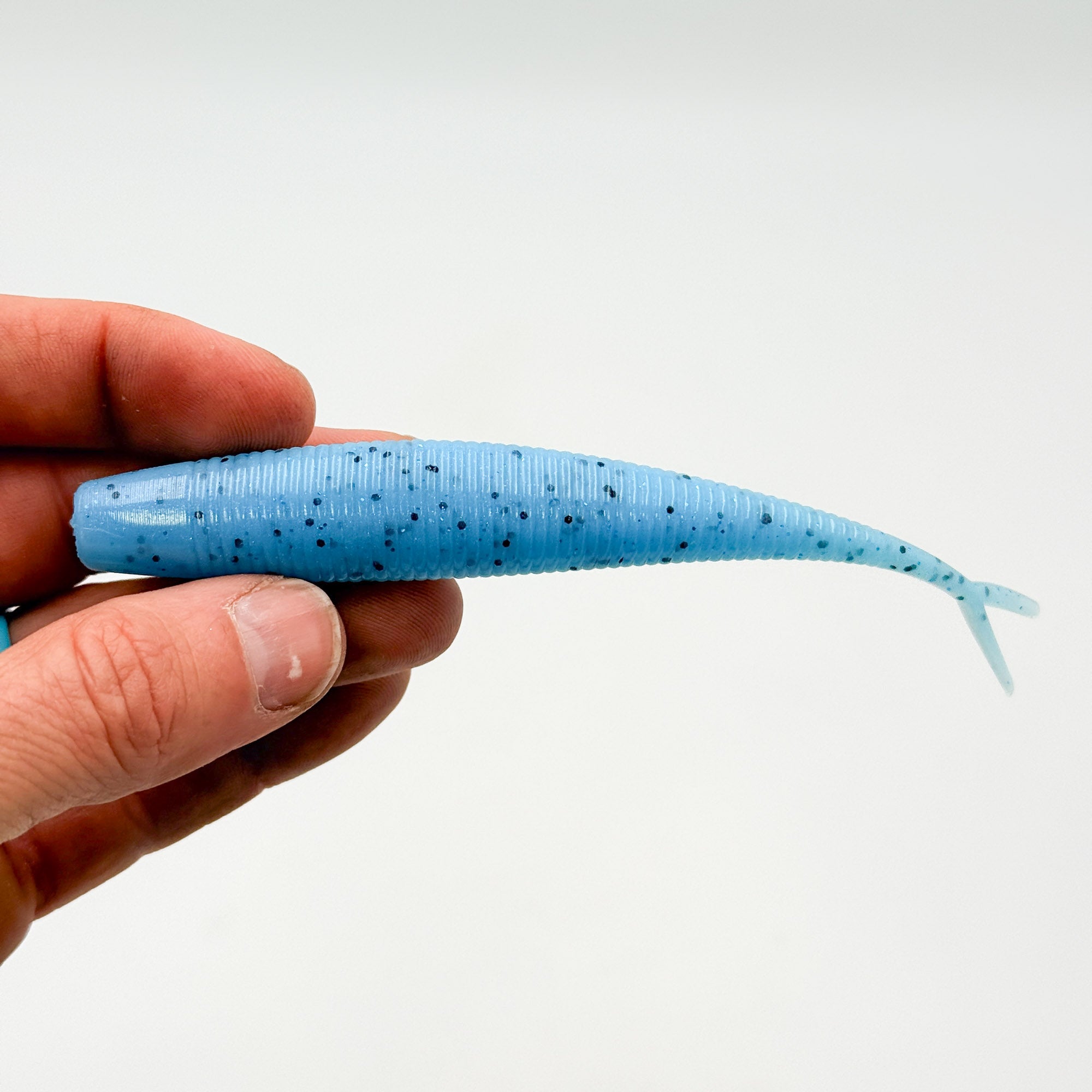This versatile bait measures 5.2 inches from nose to tail with a body width of .72" and a mid-body thickness of .67".  This bait can be used on a big ned rig to mimic dying bait fish, a chatter bait trailer with insane tail action, on a large round jig head for mid strolling or even on a hover style jig. Great with forward facing sonar and without!