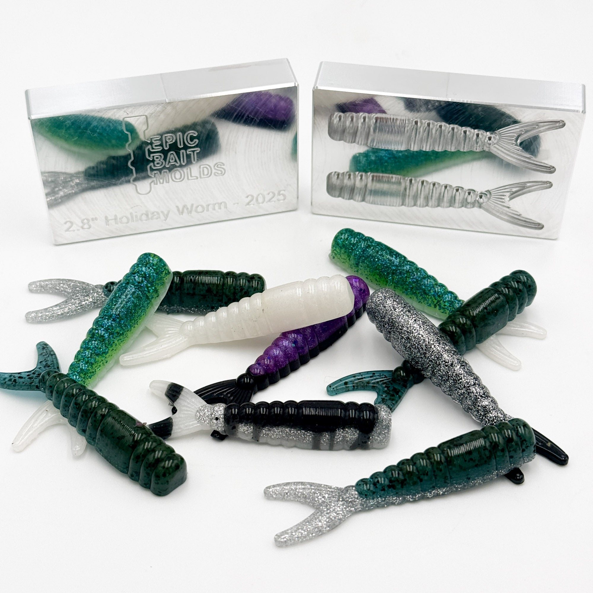 The 2.8 Inch Holiday Worm is a new open pour worm design that is only sold exclusively from Black Friday until the end of 2025 as part of an Epic Bait Molds community holiday tradition. This mold is FREE for all orders of $150 or more during the Black Friday/Cyber Monday sale and can also be purchased separately as well.