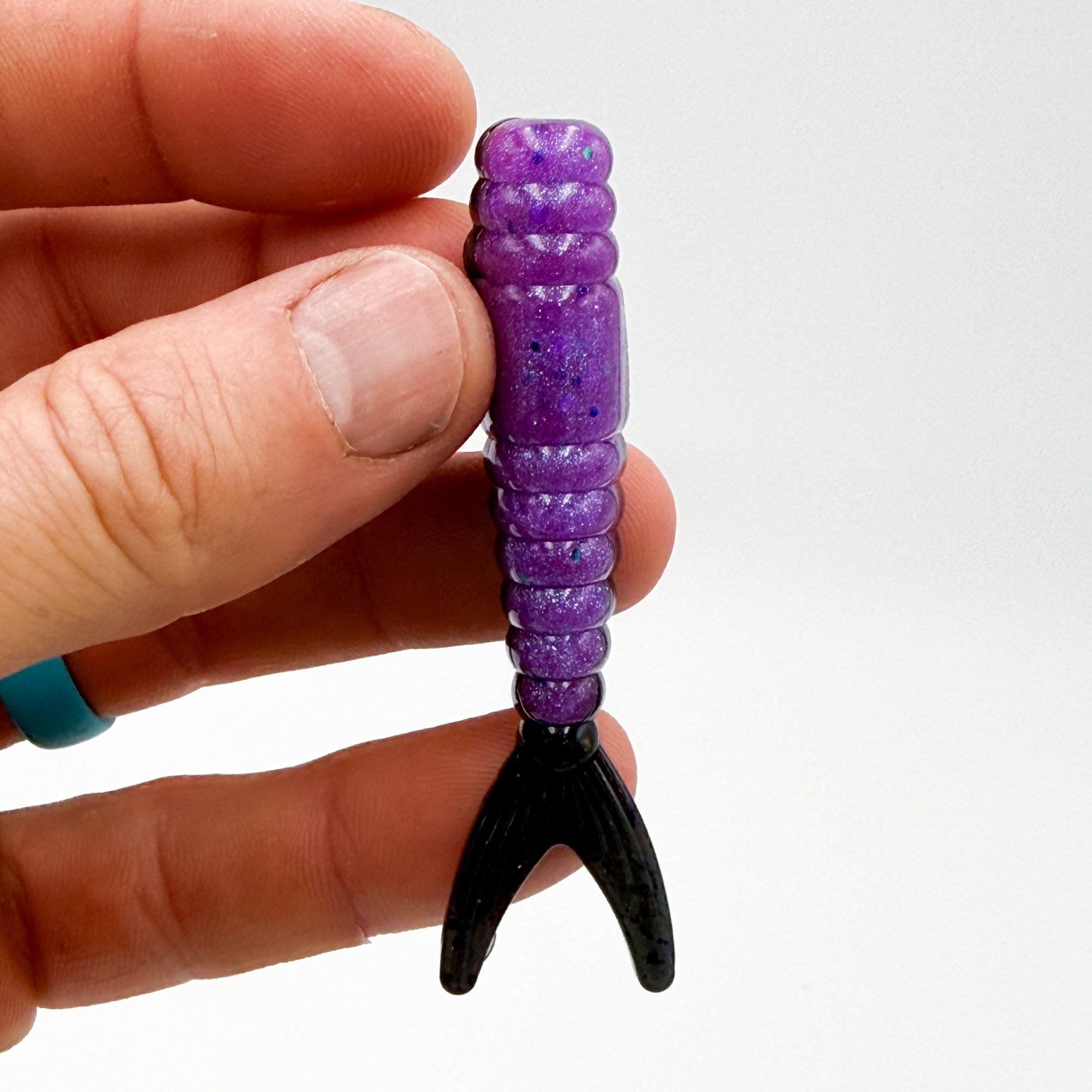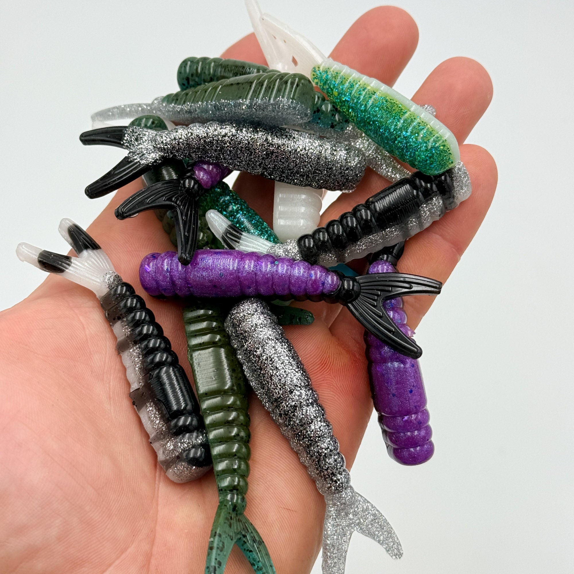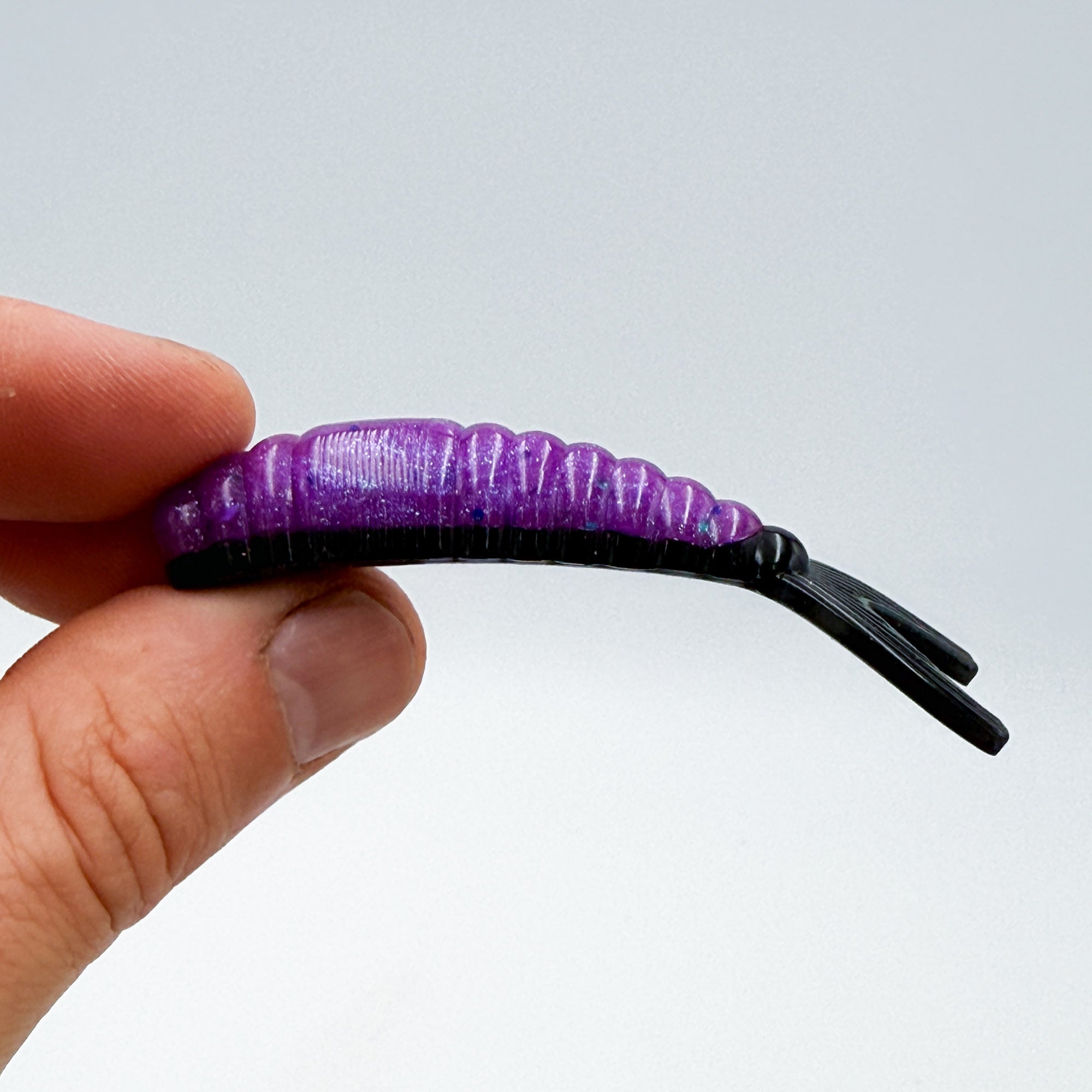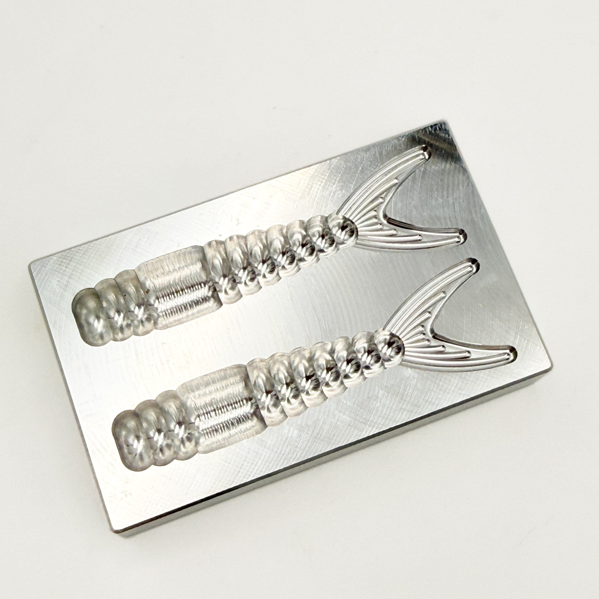 This bait is a ned style bait featuring aggressive ribbing on the body and a forked fish-like tail. The width of the body at the thickest part is .52" and the height is .41". This bait profile mimics a wide range of natural bait from shad and worms in freshwater and shrimp in saltwater fishing. This open pour mold design creates a flat bottom on the bait and easily allows for layers of color and design.