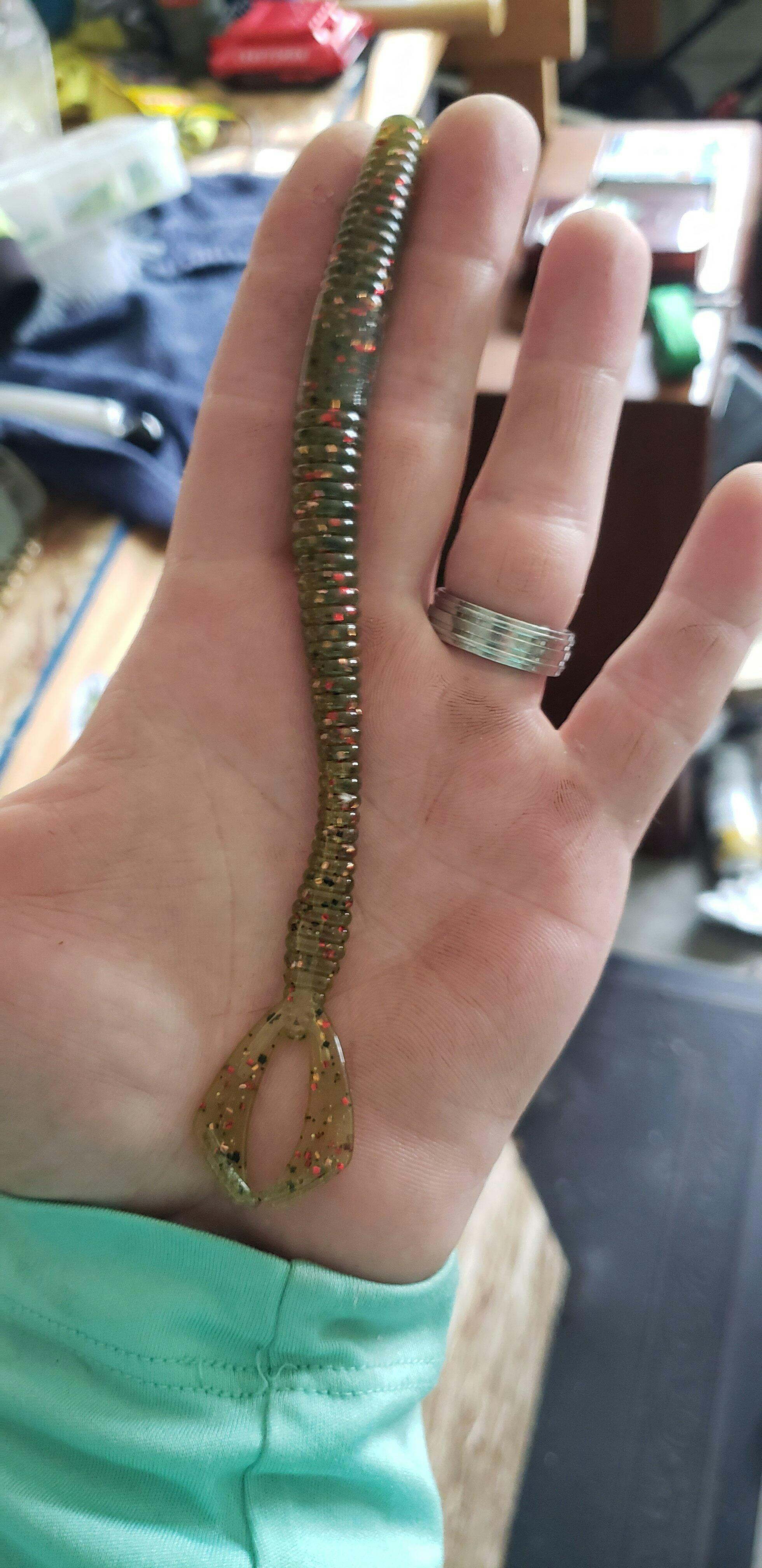 The 6.6 inch Marathon Worm is 6.6 inches long from end to end, including fins. The "worm" body is 5.7 inches long and .44 inches in diameter at the thickest part. The body shape resembles a night crawler and features a flat diamond shaped tail that is thin from the side profile. This body profile gives this bait a ton of action even with slightest rod or water movements. The appendages off the back are about 1 inch long and kick while the worm is in motion while resembling the claws of a smaller crawfish when sitting still.