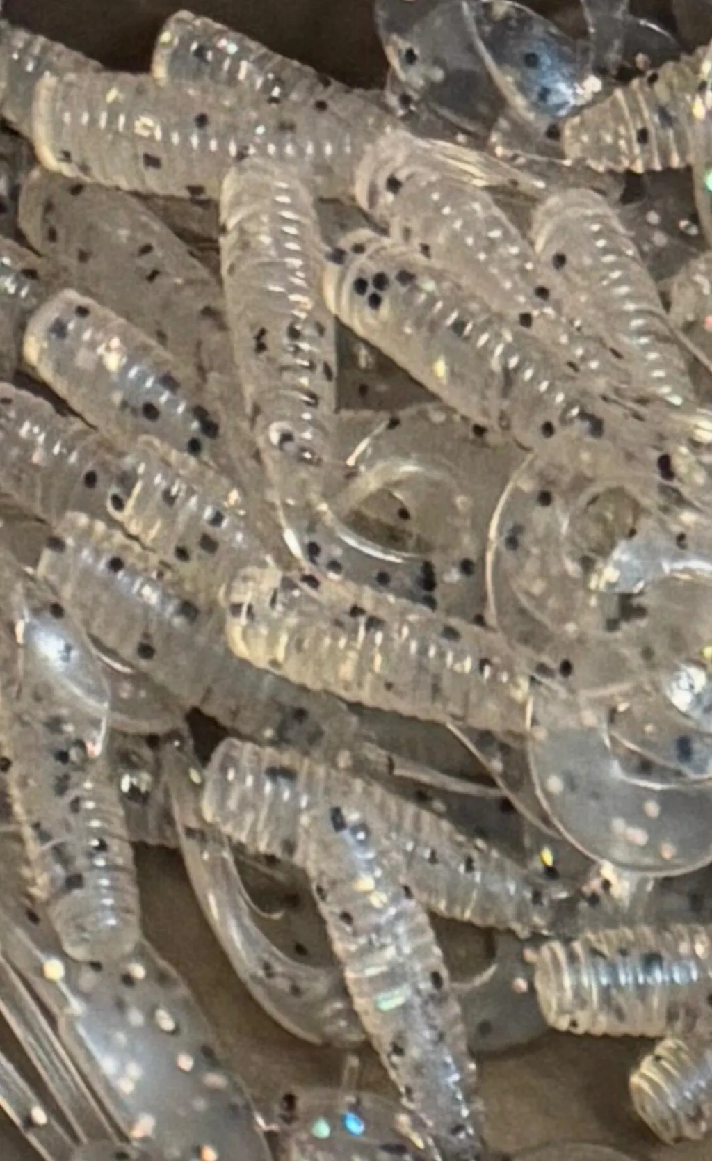 The 2 Inch Curly Tail Grub bait is just under 2 inches from nose to tip of tail with the tail extended. It features a ribbed body that has a thickness of .25" and length of .85". The tail is thin and very "curled" to create a very flowing back/forth twisting motion while on the fall, slow retrieve or fast retrieve. This mold has 16 cavities total and can be laminated with the use of a dual or triple injector (not included).