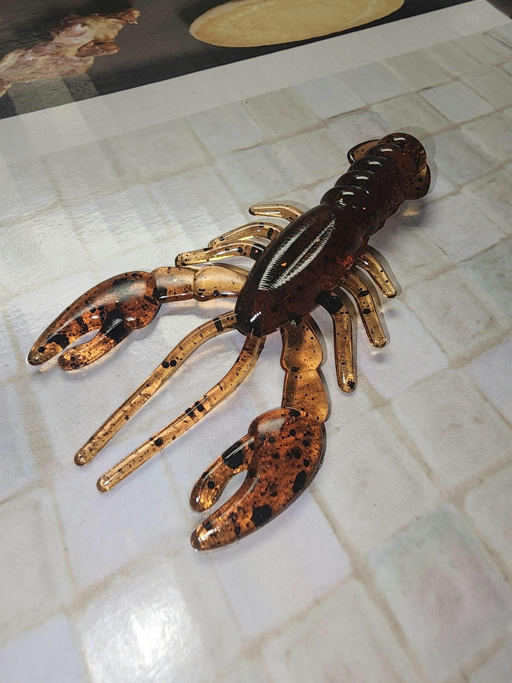 The 3.4 Inch Glory Craw bait has a total length of 3.4 inches from tail to tips of claw/antenna and a body thickness of .5". This bait features a lifelike craw profile featuring legs, antenna, and claws in the "defense position." The top of the bait features a small indented hook slot to help align your hook point and to help hide the hook point when rigged with a swimbait or EWG hook. This mold is for use with hand injectors and can be laminated.