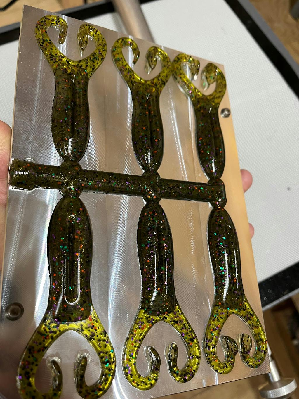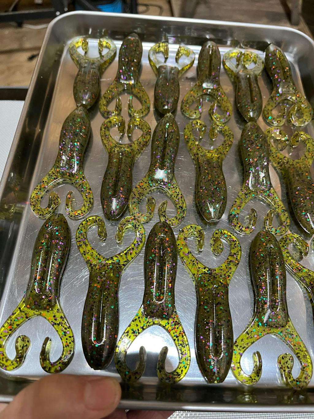 We recommend a medium/hard blend of plastisol such as Bait Plastics 262 for this bait to get the proper spring action out of the legs.