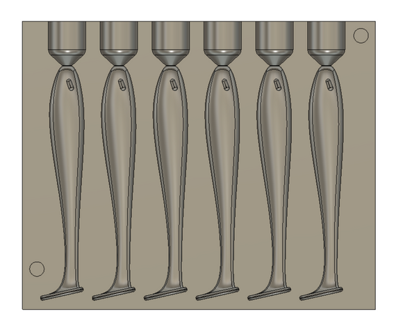 This is a 6 cavity "top shot" mold which allows you to use two injectors and a mixing block (not included) to shoot top/bottom laminated baits.